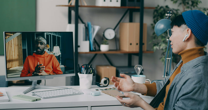 A person participates in a video call from their home workspace. Remote work solutions help save time while maintaining strong productivity.